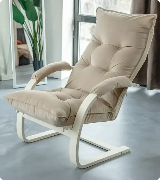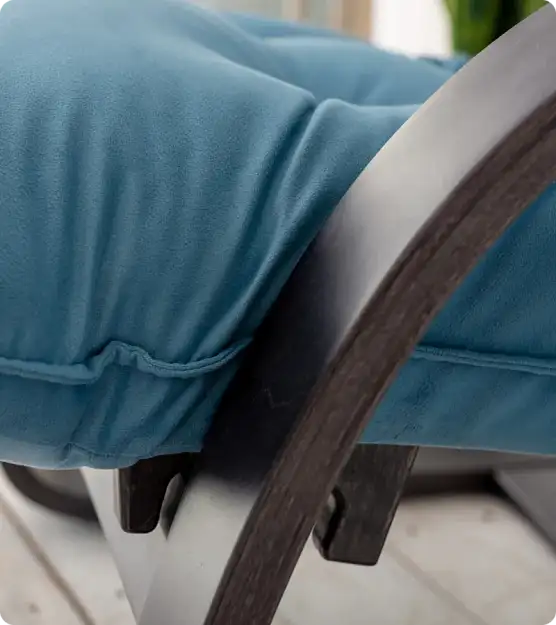 Кресло-раскладушка на ножках-полозьях имеет прочный каркас, покрытый двумя слоями итальянского лака, что защищает покрытие пола и предотвращает сколы на каркасе. Чехол и мягкие накладки на подлокотниках съемные, закреплены на молнии и липучках для удобства. Для обивки кресла использован практичный материал рогожка, сиденье проложено эластичным пенополиуретаном и декорировано пуговицами.